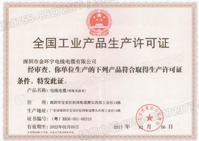金環(huán)宇電纜生產(chǎn)許可證