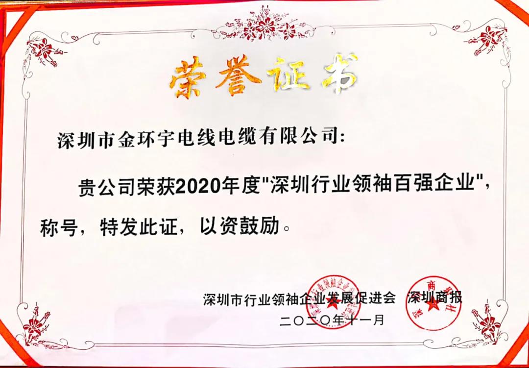 深圳市金環(huán)宇電線電纜有限公司本次很榮幸入選“2020深圳行業(yè)領袖企業(yè)100強”。